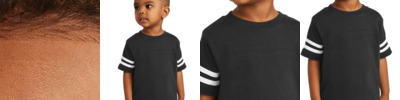This football-style tee will have your toddler feeling like he's part of the team. 4.5-ounce, 100% combed ring spun cotton fine jersey 60/40 combed ring spun cotton/poly vintage heathered fine jersey (vintage colors) Ribbed collar EasyTear ™ label for additional comfort and ability to brand as your own Shoulder-to-shoulder taping Coverstitched front and back yoke Contrasting stripes on sleeves Double-needle sleeves and hem